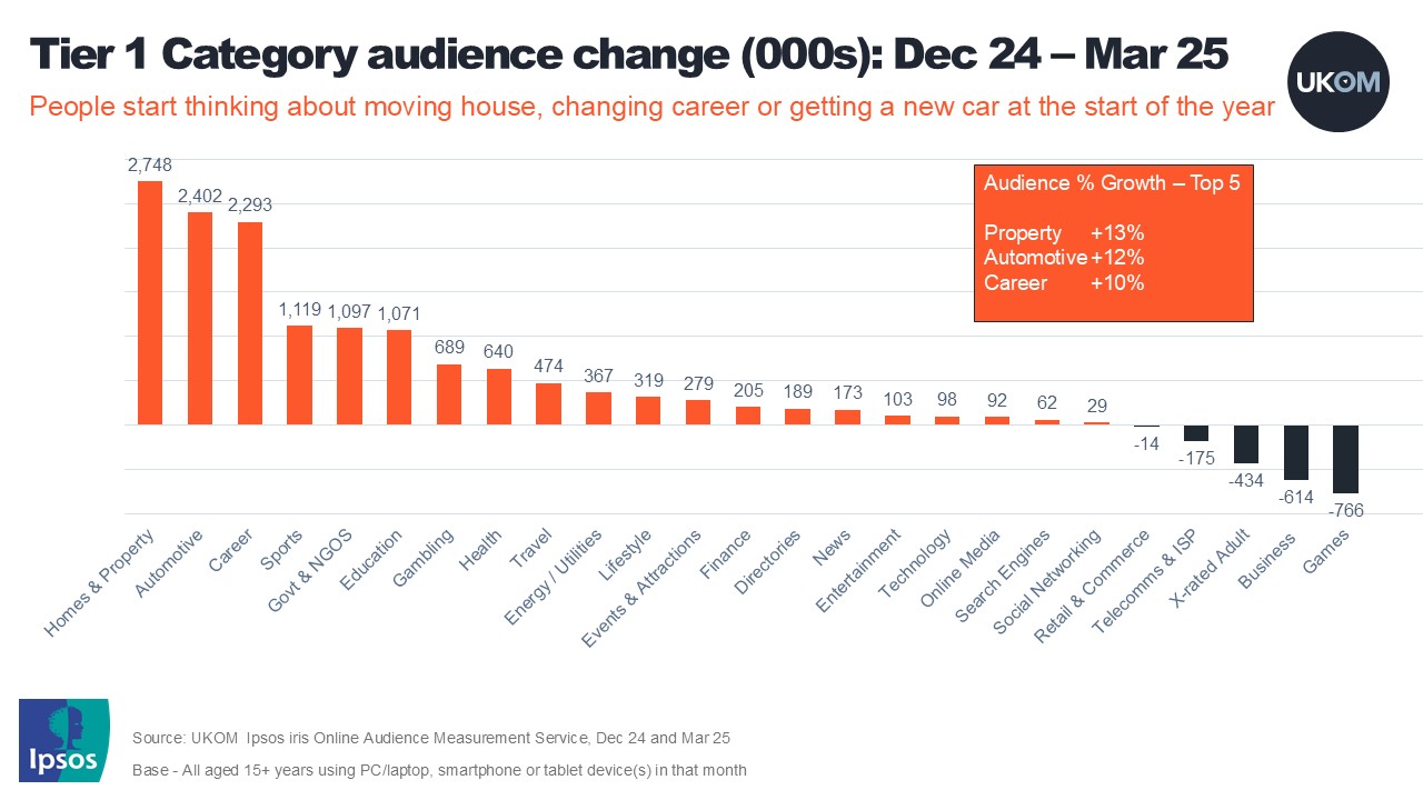 - Categories adding audience between December and March include Homes and Property (+13%), automotive (+12%) and careers (+10%) as people turn their attention to job, house and car searches. Sport also attracted audience with Rugby and motorsport being the main drivers due to the Six Nations and start of the F1 season.